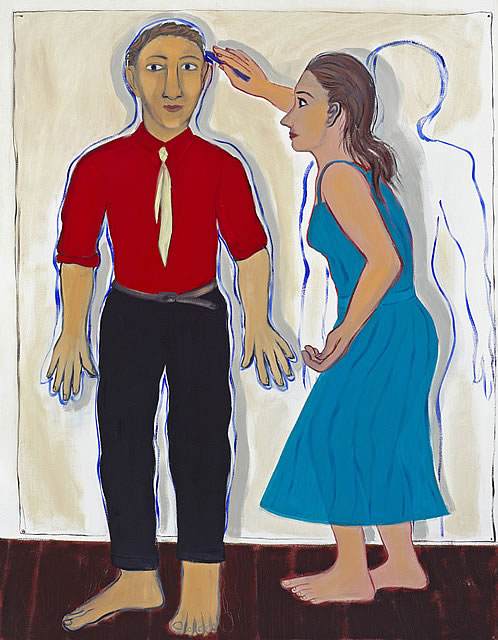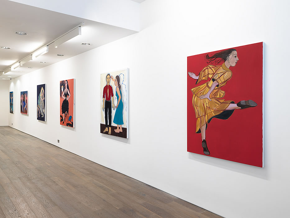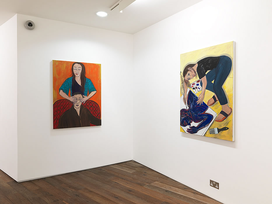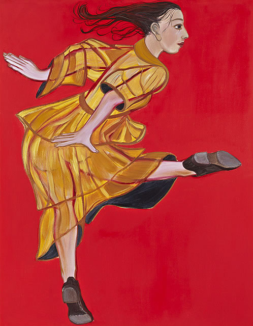 For her latest body of work, in a bold step towards more minimalist settings for her protagonists, Cooper strips away the casual clutter of her previous narrative environments to present us with flat rectangles of opaque colour: bold pop grounds of cadmium red, acid yellow and ultramarine blue are laid down straight from the tube and scrubbed onto the canvas without reworking. These monochrome grounds are the ideal complement for the fresh sense of exhibitionism and dynamic confidence being displayed by the figures that inhabit them. Cooper's ongoing narrative themes - the artist, the dancer, the actor, the healer - evolve and flourish on these coloured stages. She concentrates on the activities of the single individual suspended in a moment of intense creativity. Be it dancing or acting, this pivotal moment is conceptually aligned with the poise of the painter at the easel, brush in hand, about to engage.