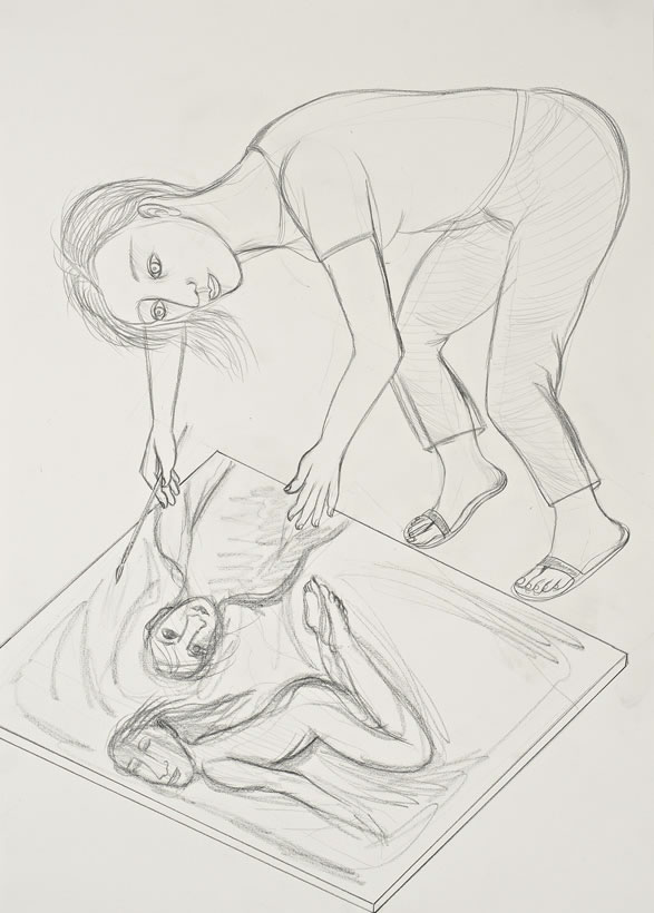 Characters like the woman in the key work, Showing Off, who twirls in her golden yellow dress, typify those who appear in the paintings as self-absorbed, immersed in their creativity and universally recognizable. The protagonists are predominantly women who take centre stage with confidence and evident joie de vivre. Male figures do appear, for the first time alone, contemplative or as a quiet companion. In Tracing the Line, a gentleman stands, back to the wall, his body traced in blue outline by a focused female companion who leans away from her own imprint already drawn on the wall behind her. Cooper conjures a witty visual pun on the illusionistic nature of painting here, echoed in the work, Artist, where a nimble painter works on an image taken straight from Cooper's back catalogue; a painting within a painting.