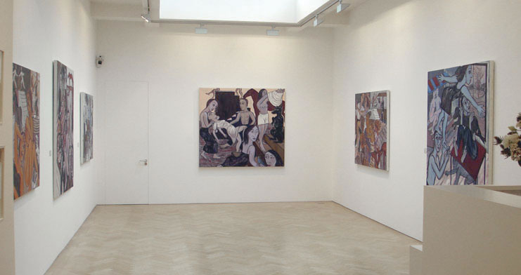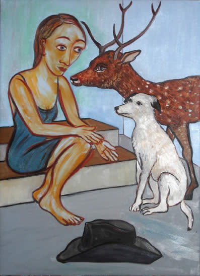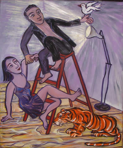 We are pleased to present this new body of paintings and works on paper to mark a signal moment in Eileen Cooper's career. The narrative is broadened, remaining mysterious and unspoken, the cast of characters is radically expanded and the settings, still generic, include stage sets and rehearsal studios. Tigers maintain a powerful symbolic presence within her imagery, but many other animals have wandered into this new world, often seeming completely bemused.