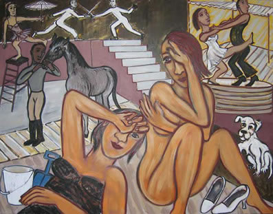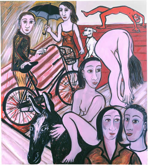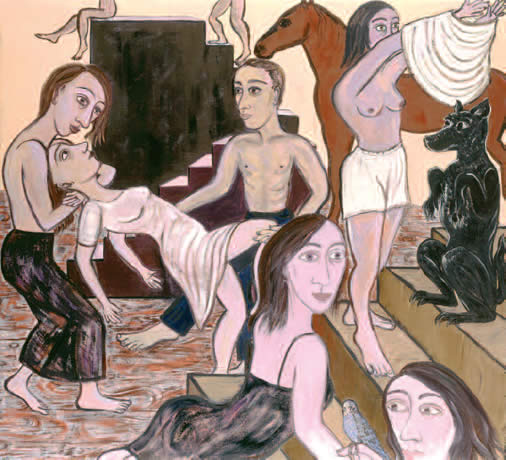 With the familiar vigour engaged and transformed, Cooper still grabs our attention. The scenes are sometimes quite tumultuous, the palette newly restrained and the iconic nude figure ­ part self image, part archetype ­ has a theatrical group of clothed companions, all of them having 'times of their lives'.