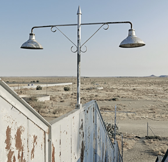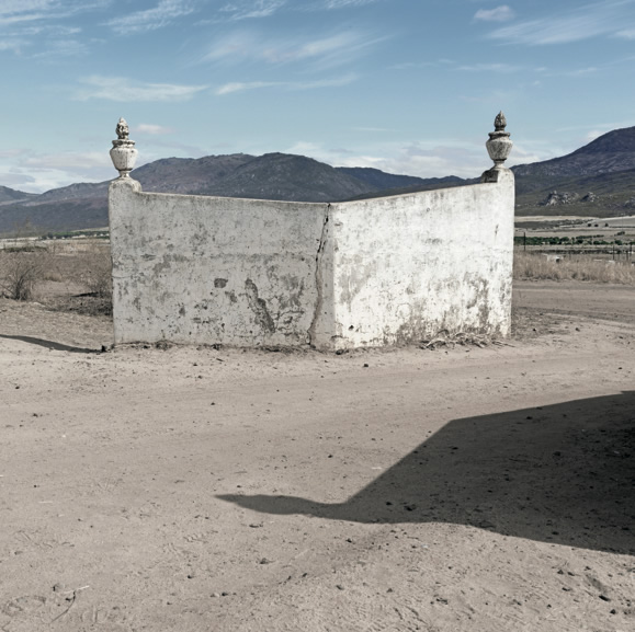 Marking Time is focused on unfinished, abandoned, re-imagined and re-invented structures within a swiftly shifting South African landscape. These, suggest Williams, reflect the ‘state of the nation’. The brevity of the captions captures the reality of a society in a state of impermanence and incompleteness. Using a square format and bleached light, the tonal images such as shared electricity supply poles, football pitches, old farm entrances near expanding townships, are familiar, or not – depending on who’s looking.