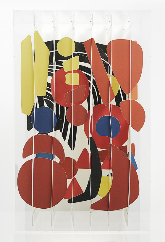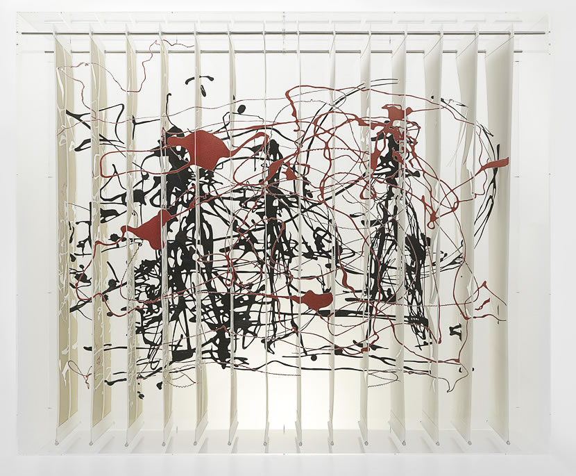 Finally, there is his interest in the art of fellow Twentieth Century practitioners. In Le Rouge et le Noir, Milroy has taken the dance of paint from a Pollock, and made it 3-dimensional. He has used the pop out shapes from a children’s book on Calder, mimicking the order of the pages to create his own Calder, a weightless suspension of forms within a box.