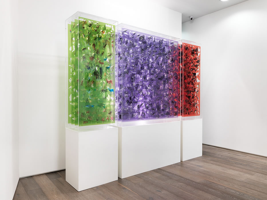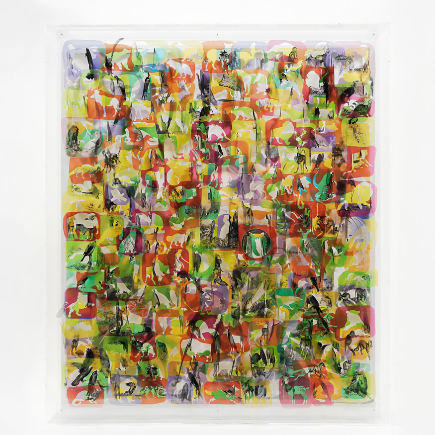 The vocabulary of images in Milroy’s work Garden of Earthly Delights reveals itself only on close inspection. The printed and cut film construction presents three chromatic divisions with black and white printed imagery skillfully extracted from the surface with a scalpel, then twisted or tilted sideways into the space between parallel layers of film. The entire structure is suspended in a transparent Perspex box, which offers fascinating side views as well as the full frontal impact. The work’s intricacy is breathtakingly inventive as elephants, giraffes, gorillas and all manner of other flora & fauna emigrate from the green zone of Paradise to a more purple space of extremes. Rolls of bank notes, fast cars, brand names, diagrams from a year’s worth of daily sexual positions, signs of gluttony and excess and now and then a direct borrowing from Bosch himself lead the viewer towards the final zone of hellish red to the right, full of tumbling figures and accelerated chaos.