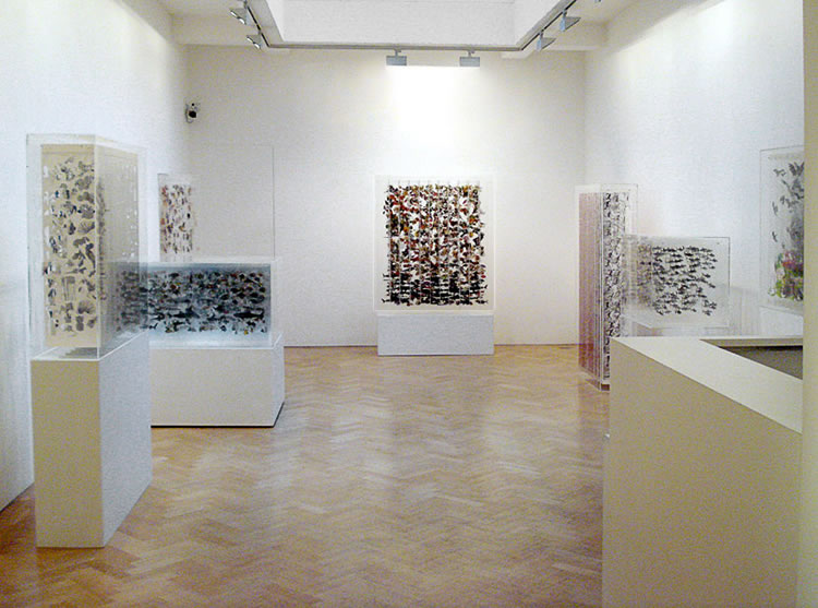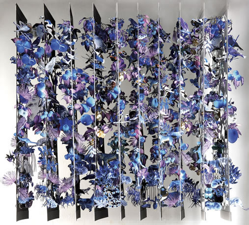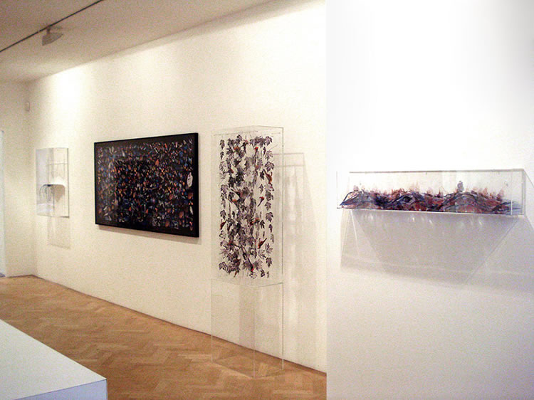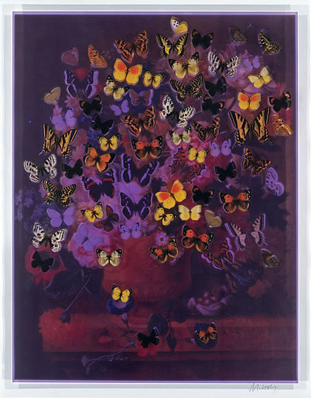 Milroy cuts things with a scalpel, to make virtuosic, three dimensional constructions in paper and film which are installed in clear perspex boxes. He cuts up books to release their contents in anarchic novel arrangements, or he uses his computer and a state of the art Epson printer to make archival inkjet prints from intriguing manipulations of imagery, as in The Garden Series.