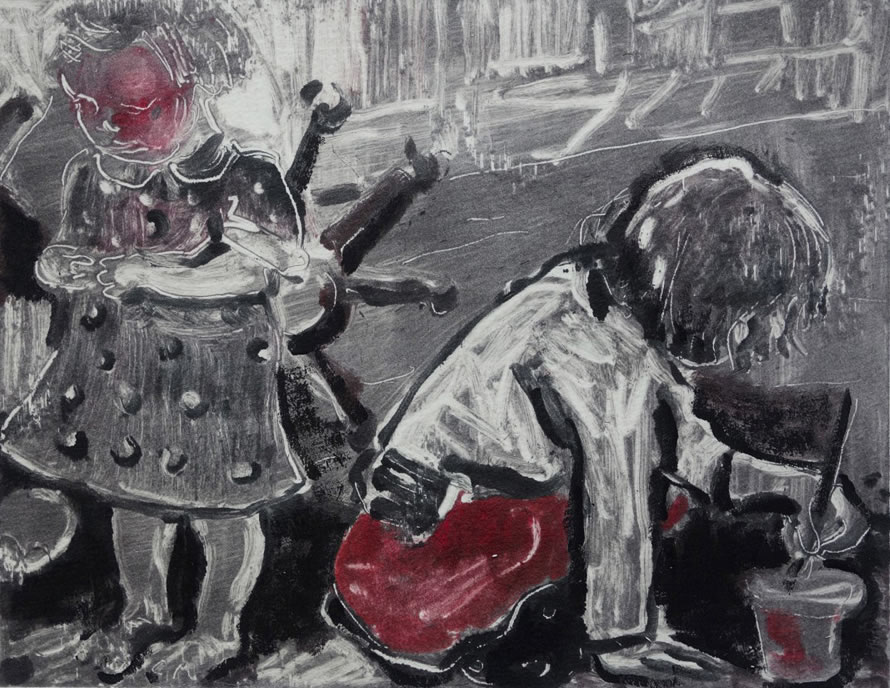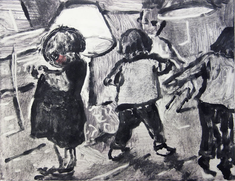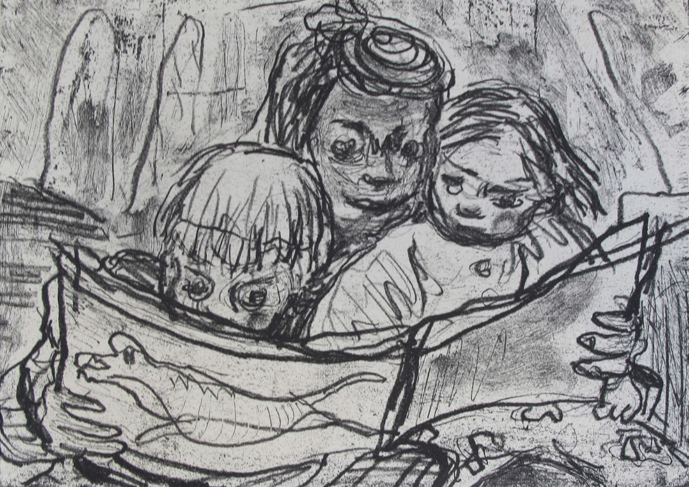 Open the Box offers an engaging body of work in which family life, with its focus on the creative antics of young children, has become the principal subject. Humour abounds in the rich, spontaneously worked surfaces and in the speedy line of drawings, monotypes and etchings, where the artist’s observant eye follows the constant activity of her small subjects. She captures their winning, un-selfconscious expressions in a series of lively, intense vignettes. The secret spaces that young children are drawn to: dens, playhouses, tunnels under the sheets, the space behind the couch, inform the compositions. These claustrophobic places that we peep into and that they peep out of are the starting point for many of the works in Open the Box.