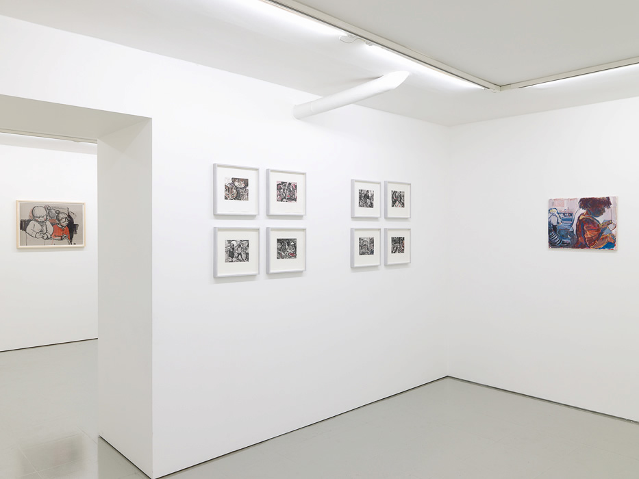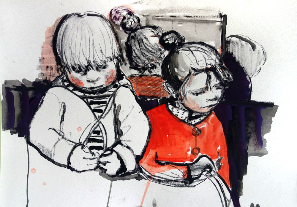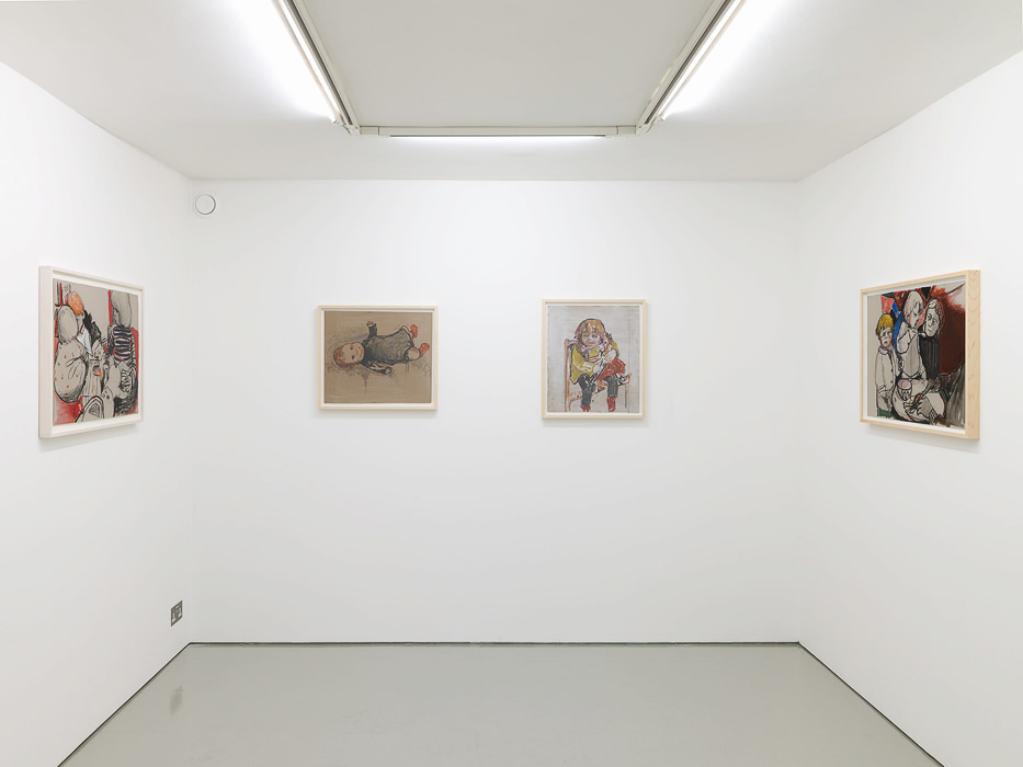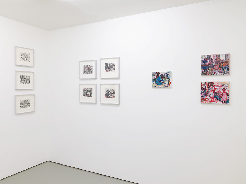 Figurative images with no predetermined narrative are wrested from the close domestic arena. They are drawn from every day life and snatched from covert viewing points. The child’s body is also drawn as an expressive solitary figure performing activities in a series of offset drawings - old themes - dancing, drawing, pulling a thorn from a foot, licking an oversize spoon. Peripheral figures from this intimate space hover: the auntie, papa, grandmère and the family cat. A baby appears creating a new, private space.
