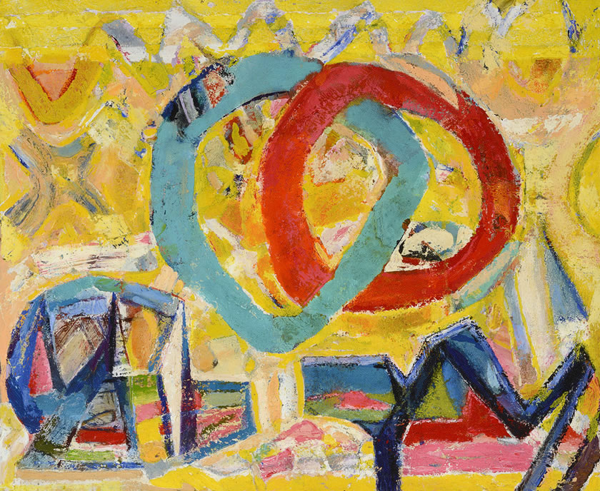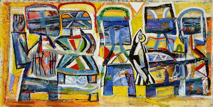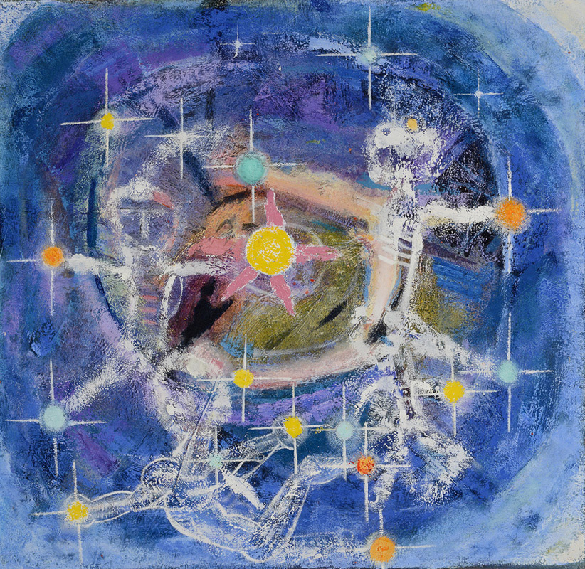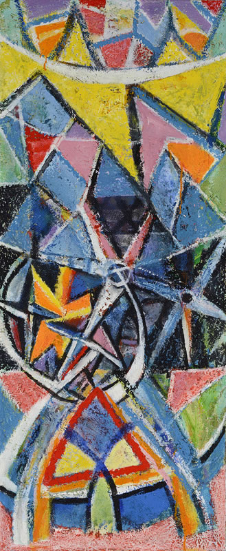 Return journeys to South Africa after 1994 renewed an interest in rituals and places of his youth. Memories of colour and traditional forms have re-‐entered his vocabulary in these significant canvases, which have emerged slowly and knowingly from the hard won space of his London studio. Both 'Ndebele Gate' and 'Ndebele Woman' reflect the impact on Maqhubela of his recent visits, whereas 'Galactic Parade' conjures a private world of serendipitous, joyful forms, and 'Transition' presents a culmination of his ethereal, abstract concerns.
