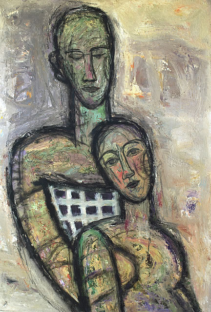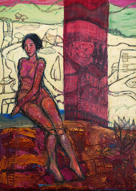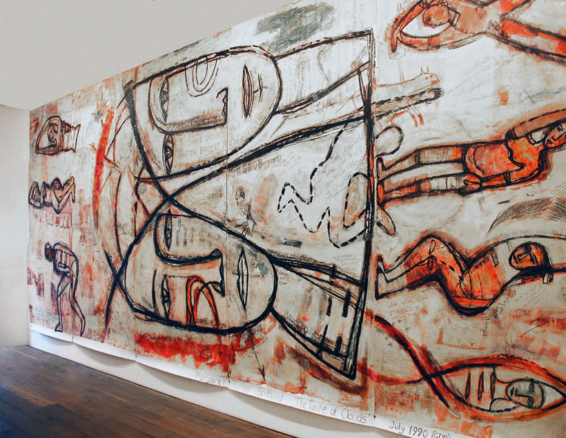 Berlin is a radically transformed city from the one Margaret Hunter came to know when she moved there in 1985. She witnessed the heady moments in 1990 when in a triumphant celebration of the defeat of communism, the Wall was pulled down, and she joined 119 international artists to mark this precise moment of liberation with paintings, on a specific section of the previously inaccessible eastern side of the wall. Joint Venture portrays two heads, the two Germanies, lying side by side surrounded by small figures responding to their new situation.