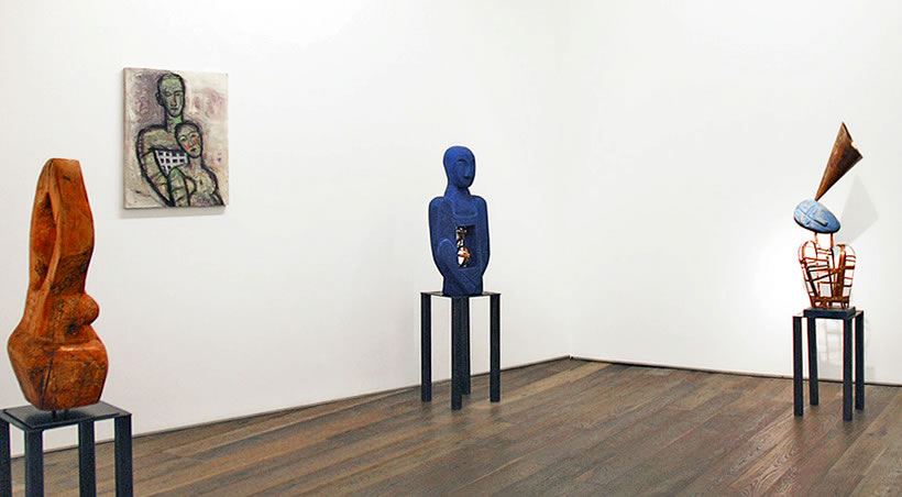 Reconnected in this way with an earlier work, Hunter has recreated a version of her Wall painting, this time on large sheets of paper. It is the focus of her new show, which includes sculptures in wood and metal and a series of vibrant drawings and richly coloured and textured panel paintings.