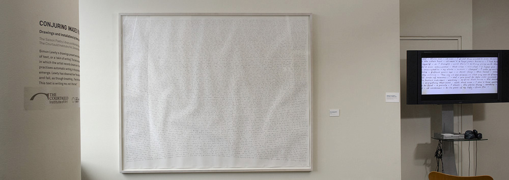 Saison Poetry Library Royal Festival Hall with Lewty's "Drift, the Intelligence of the Beginning' 2007 and on screen the film directed by Tom Hudson called 'Through the Surface - the work of Simon Lewty', with the poet Peter Larkin asking the questions.