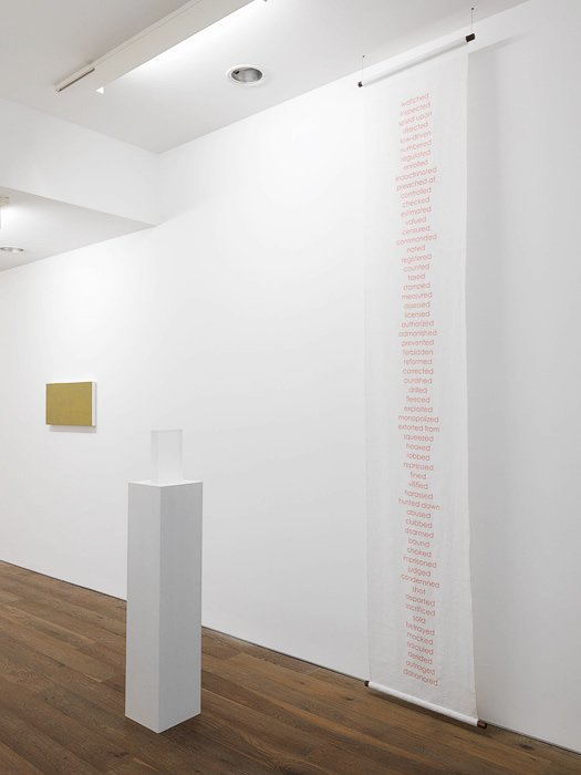 By way of introduction to the show, a work in ink on Chinese linen, called To be Governed... (Proudhon), lists extreme expressions of dissatisfaction with society, sourced from the writings of the 19th Pierre-Joseph Proudhon. Morley quotes from the full text: