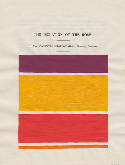 My subsequent research revealed that most of these roses were no longer 'in commerce', so the only record of their colour was the poorly tinted photograph and the brief verbal description. I set about painting seven small works in these colours, and painted the name of the rose over the top, so that they are like epitaphs to the departed roses, as well as to the ladies. I also made one larger painting which commemorates a yellow rose named after the son of an illustrious breeder of the period who had been killed in the First World War, Souvenir de Claudius Pernet. Alas, this rose is also now defunct. The largest Rose Painting is brilliant white in colour and uses the text from an advertisement in the Annual: British Roses (Guaranteed). Finally, I painted a series of 'Paragraph Paintings' on pages cut from the Annual. Here rectangles of text are replaced by rectangles of colour, like beds of roses.