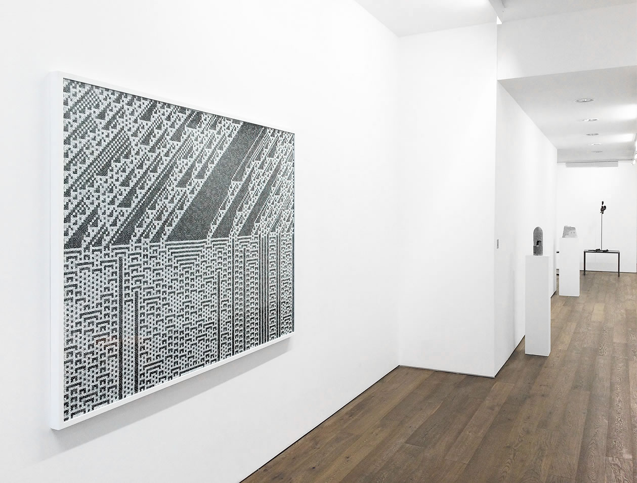 In TROIKA's Calculating the Universe the action decided upon, that allows the creative process out of the makers hands, is the introduction of an algorithm, which determines the outcome of the work. The intervention of 'chance' here is somewhat illusory, as the algorithm acts on its subjected material (thousands of neatly assembled black and white dice) not in an arbitrary way but with perfect mathematical certainty. The element of the unknown for the creators here lies in the lack of control over the resulting pattern that ensues – sometimes chaotic, sometimes neatly resolved and continuing in orderly fashion into infinity.