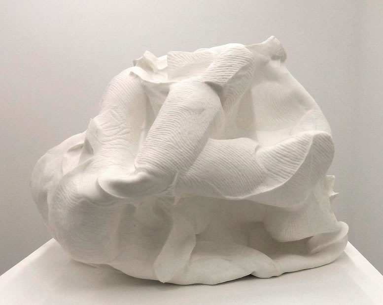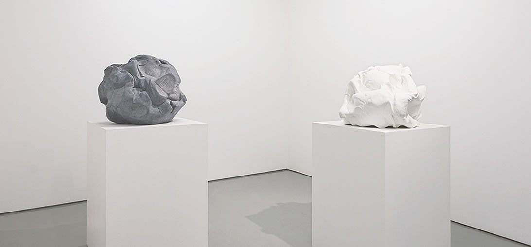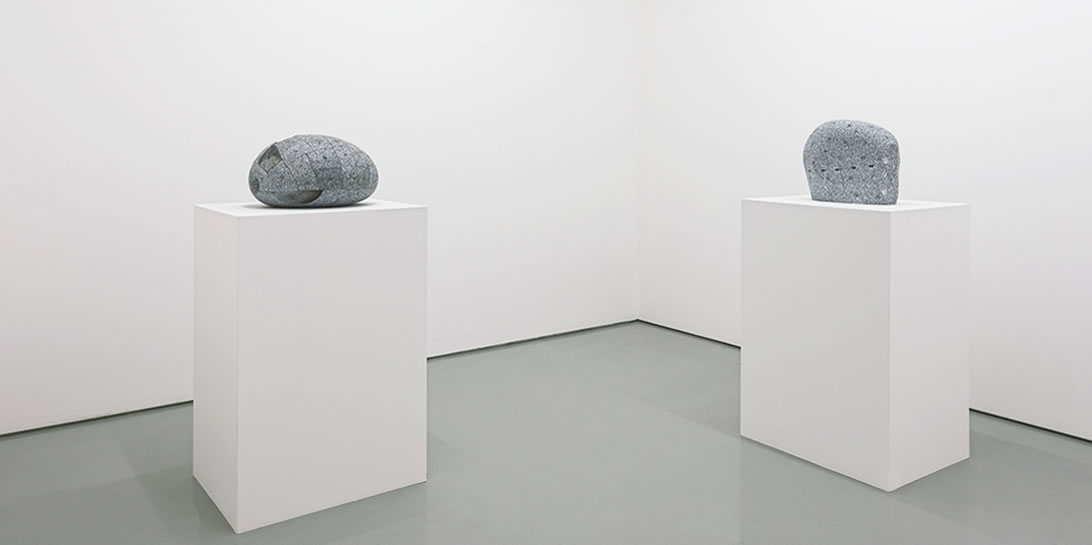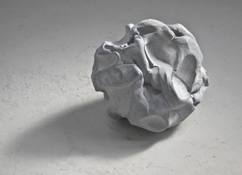 Starting with a hand-sized ball of soft clay, I work blindly, manipulating the felt form, probing its skin. The resulting shape describes the space in-between the fingertips, with imprints left to document touch and to map the space. Then the form is translated into stone, carved from a single block, giving the impression of a fragile permanence.