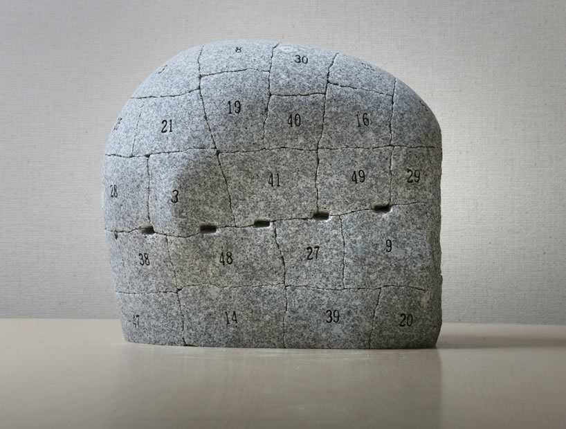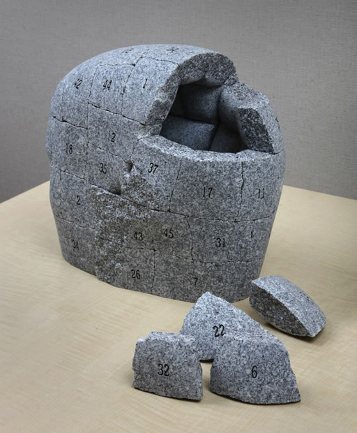 'Splitting and returning' or 'wari modoshi', embraces a traditional Japanese method of stone carving in which larger blocks are split into manageable portions then to be fused into a single sculpture. Taking this convention to engage with issues of contemporary life and art making, Okamoto entrusts his fragments of stone to selected people around the world for five years. During this time, they absorb their surrounding environment and take on a unique colour, before they are returned to be meticulously reassembled into a 'Turtle' piece. This 'infiltration of life' as he describes it, reminds us through a patchwork effect, of the movements each piece has undertaken and how alive stone is to specific traces of contact.