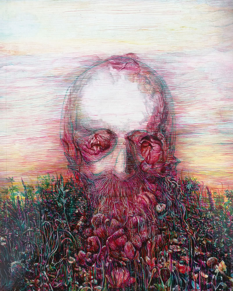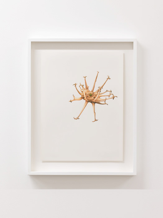 Art and Science, methods of documentation and investigation, emotional response and visual subversion all have a role to play. Materials vary; from the red and white ochre gleaned from the Transkei near Nelson Mandela’s village by Nel, to Brenner’s watercolour transparencies depicting skull formations and the soft flesh of her focused Navel Series, or Reid’s multi-plate etchings that compile ways in which information is presented, and Oltmann’s documentation of a naturalist’s collection of Chafer Beetles, to Papageorge’s mixed media notations conveying Mt Kilimanjaro’s fast disappearing glacier—each work has a specific emotional charge of its own.
