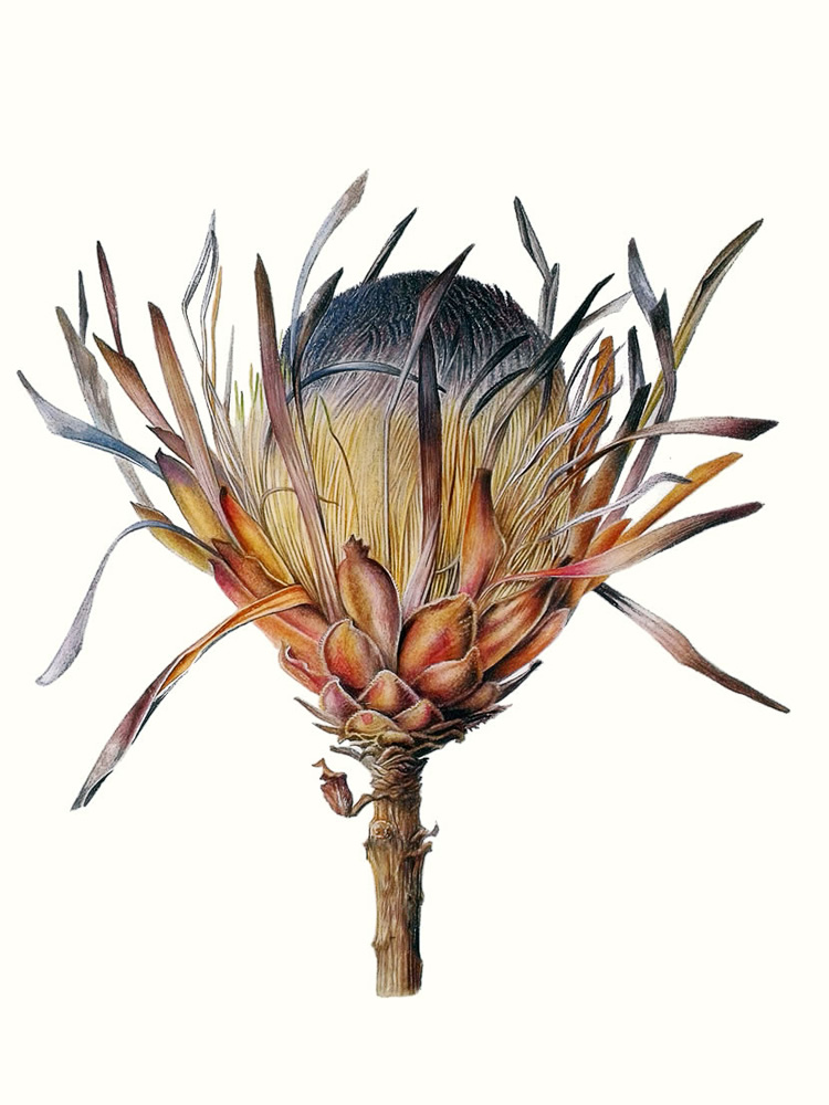 Botanical recording is a tradition long established in Britain and Gillian Barlow is one of its great exponents currently at work. Her Protea compacta is painted on vellum, with a dried, spiky appearance instead of a plant freshly plucked from its stem—an edgy comment perhaps on drought or man made conditions which threaten swathes of plant life everywhere. Goldwater invents a desert dance for her cartwheeling African Hitchhiker plant, Milroy brings his scalpel to a Kirstenbosch publication of Cape Mountain Flowers, and there are elements of surprise too.